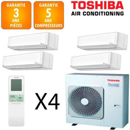 Alliant performance et économies d'énergie, ce système Quadri Split TOSHIBA Toshiba délivre 10.0 kW de puissance avec une efficacité remarquable : classe A++ en climatisation, classe A+ en chauffage. Les ratios énergétiques exceptionnels (EER 7.2 / COP 4.3) témoignent de l'excellence technologique de ce système inverter. Adapté aux surfaces de 20 à 30 m², il garantit un confort thermique constant tout en réduisant significativement vos dépenses énergétiques.