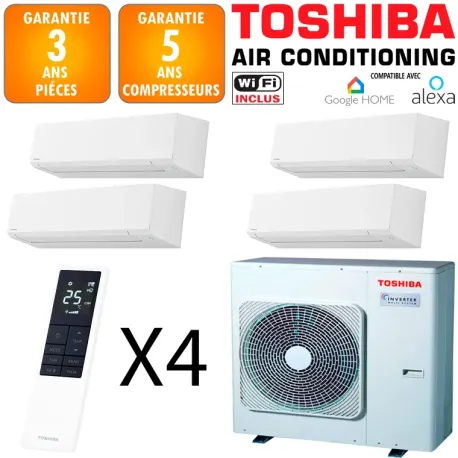Ce système Quadri Split TOSHIBA Toshiba 10.0 kW représente une solution performante pour la climatisation et le chauffage de votre logement. Ce système affiche une classe énergétique A++ en mode froid et A+ en mode chaud, garantissant des économies substantielles sur votre facture énergétique. Avec une puissance nominale de 10.0 kW, il est adapté aux pièces de 20 à 30 m² selon l'isolation. Le système intègre la technologie inverter pour un confort optimal et des performances énergétiques maximales avec un EER de 7.2 en froid et un COP de 4.3 en chaud.
